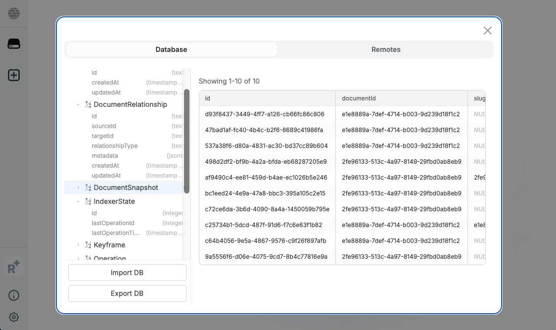 The Database tab allows you to inspect the local PGlite database that Connect uses to store documents and application data.