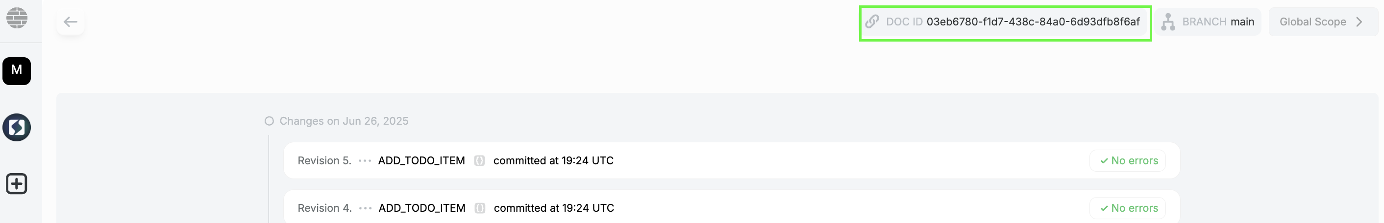 In your Document Toolbar, you will find an icon to visit your operations history. At the top of the toolbar, you will find your document ID. Copy this ID to use it in the Switchboard API.